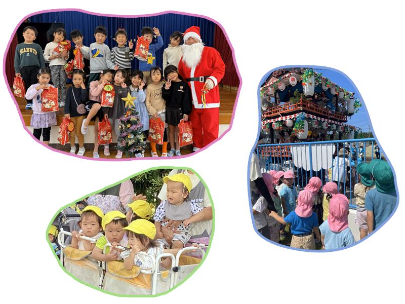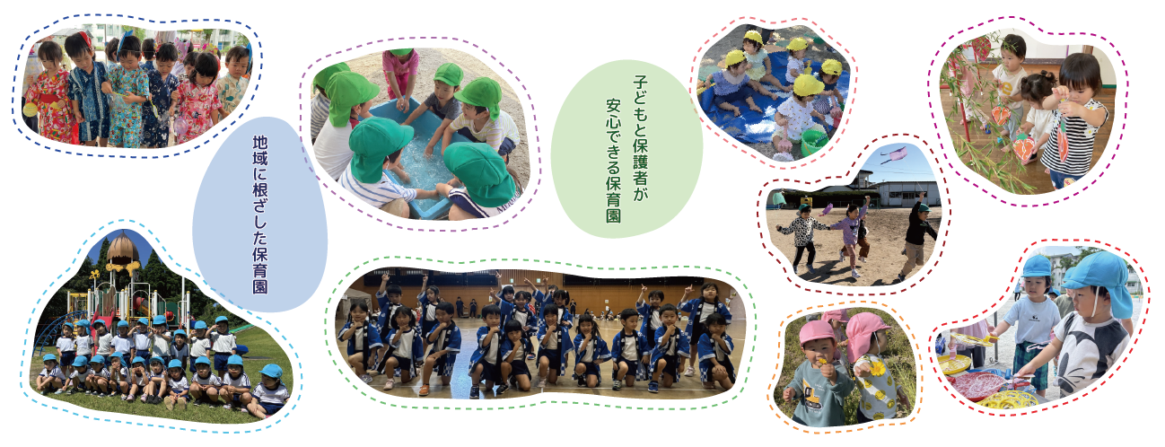 様々な年齢の子どもたちが一緒に遊び触れ合うなかで思いやりの心を育み、達成の喜びを味わいながら意欲溢れる子どもに育って欲しいという思いから、戸外遊びを重視し、遊びの中で学ぶ経験を大切にしています。年中年長児はチアダンスやわんぱく体操をがんばり、心と身体を鍛える時間も設けています。